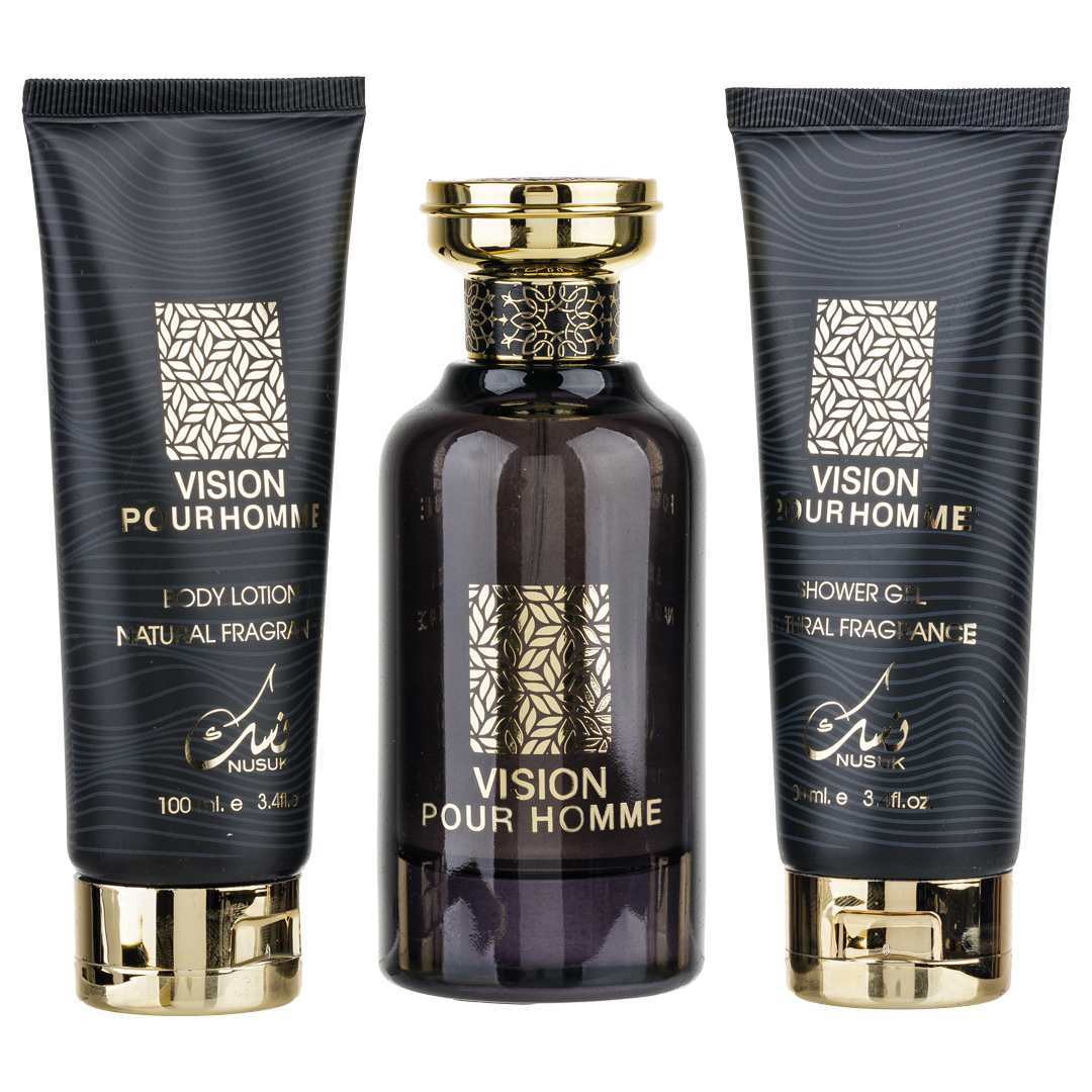 Set cadou Vision Pour Homme – Nusuk conține apă de parfum 100ml, gel de duș 100ml și loțiune de corp 100ml. Un cadou elegant pentru bărbați, cu un parfum oriental-modern, persistent și rafinat.